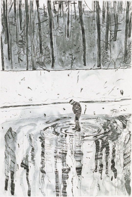 but also the multitude of lenses apparent here.. the lens of the camera that took the original photograph doig saw, and the lens in which doig saw this photograph (focussing on the awkwardness of the first-time skiers, perhaps), and the lens in which we, the viewer is looking at this painting now, which is through the brushstrokes on this surface, and each of our cultural context and common knowledge of each concept (e.g. 'snow' 'skiing' 'painting')