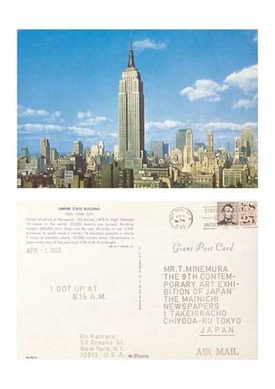 'On Kawara was an influential Japanese Conceptual artist. Best known for his Today series of paintings, Kawara produced simple, two-color acrylic paintings to document each day he woke up alive in the date, language, and format of the place in which they were made. He made almost 3,000 of these paintings in 112 different cities between January 4, 1966 and his death in 2014, with the body of work serving as an examination of the banality of existence and the passage of time. Born on December 24, 1932 in Kariya, Japan, he went on to study art and travel in Mexico where his father was the director of an engineering company. Much of Kawara’s later life was spent traveling between New York and Paris, marking the differences of life around the world through his serial artworks.'