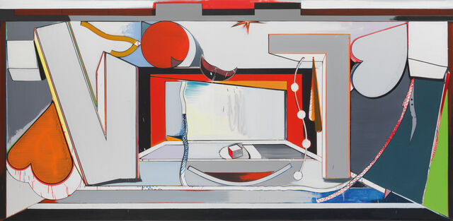 [ With all the energy and excess of youth, Rosson Crow (1982) makes paintings in which colours and forms are tumultuously telescoped while the depths are lost in a confusing abstraction. Her paintings are excessive and theatrical and resemble film sets, artificial arrangements bathed in the bright light of spotlights and deserted by the actors. Crow also presents historical interiors as well as artificial environments that she transforms into a projection plane in order to evoke a decadence that is alternately joyful and morbid.